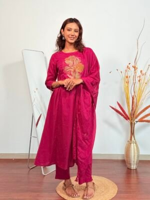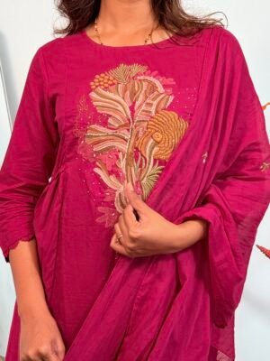 A luxurious mulmul suit set featuring intricate floral embroidery and rich fabric for that graceful festive flair.