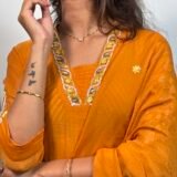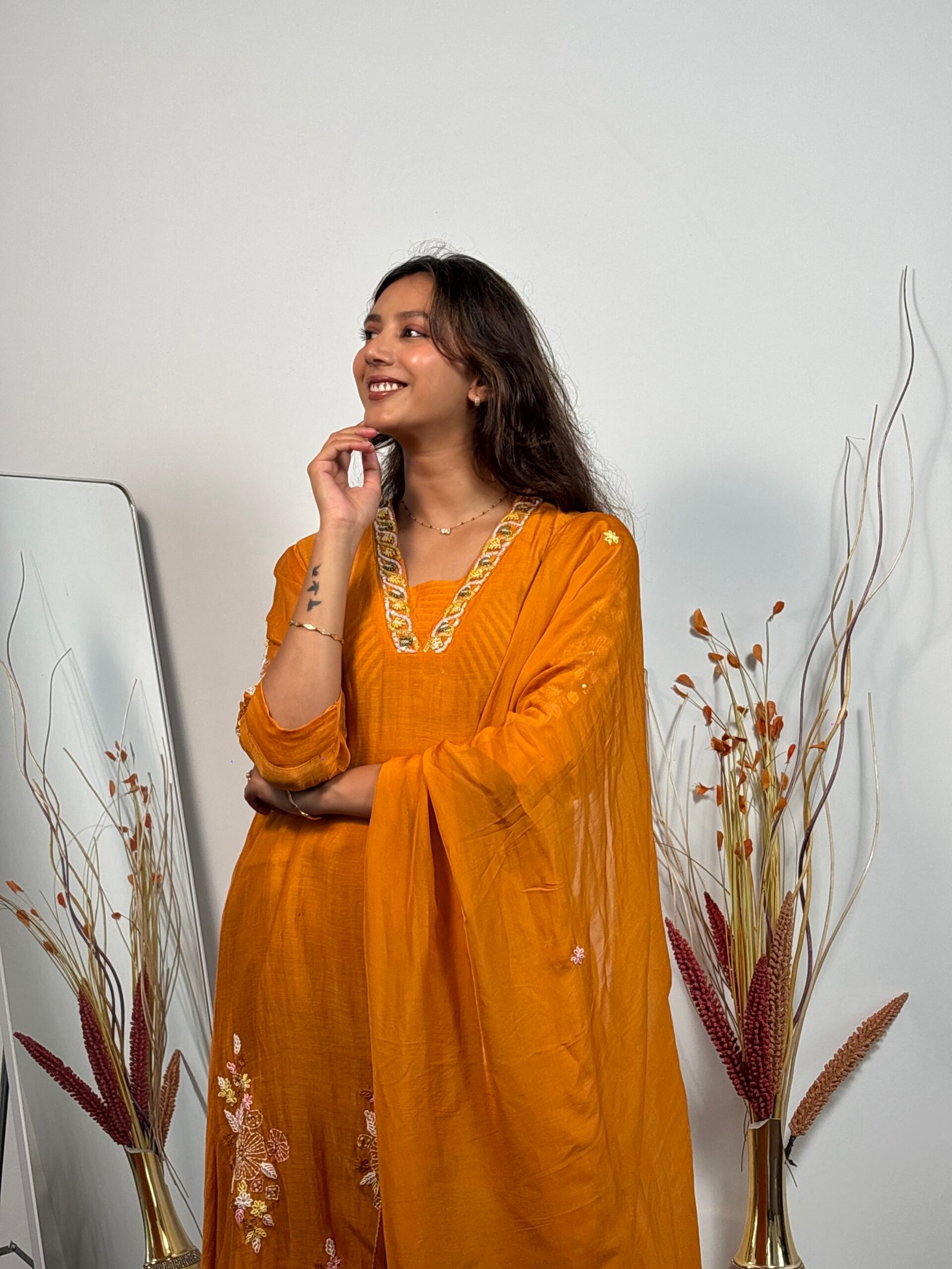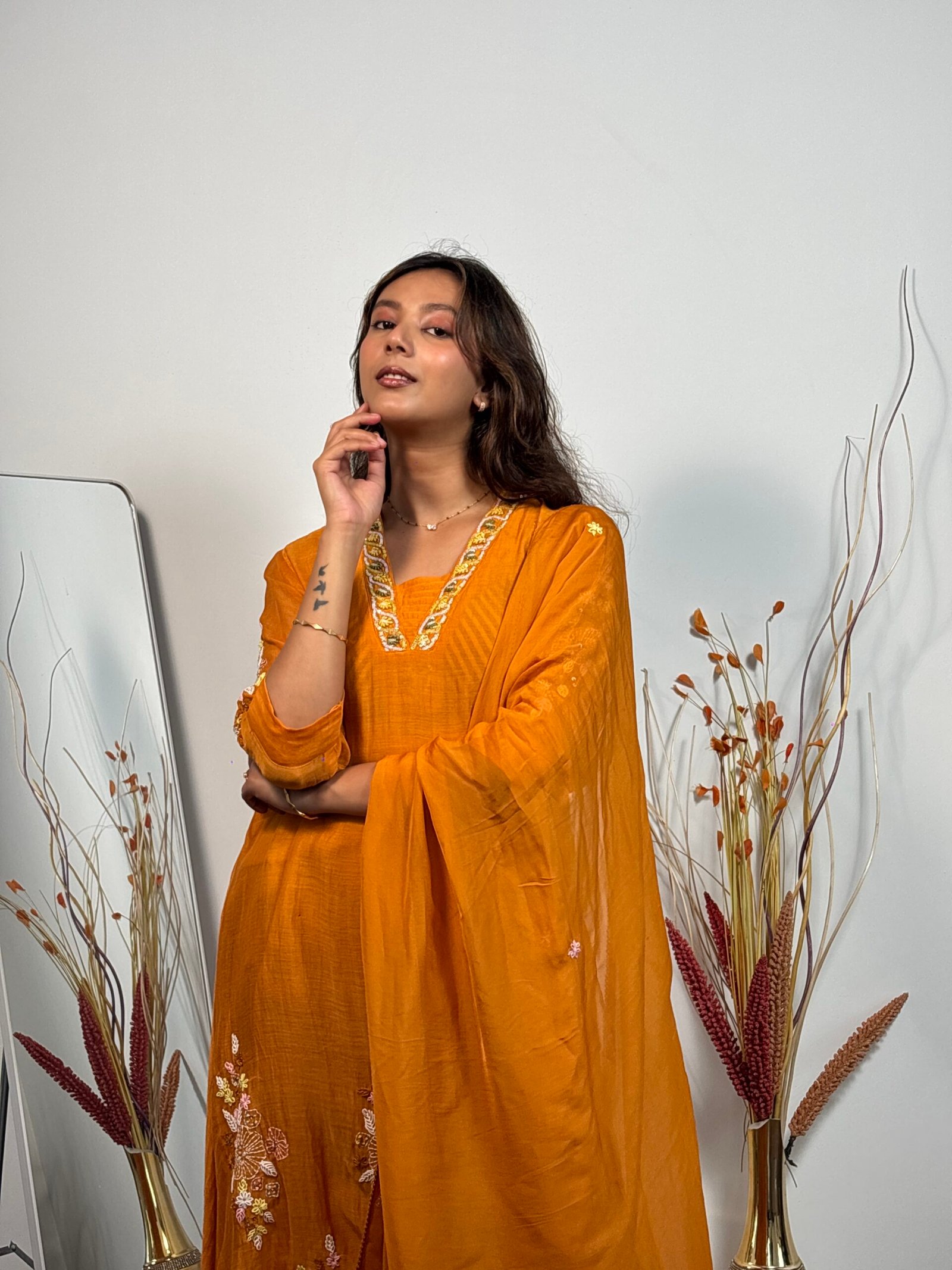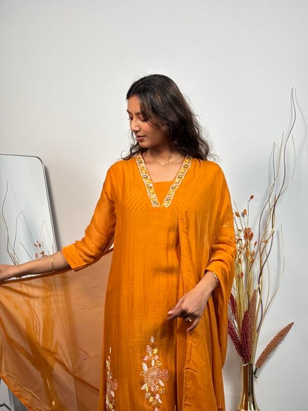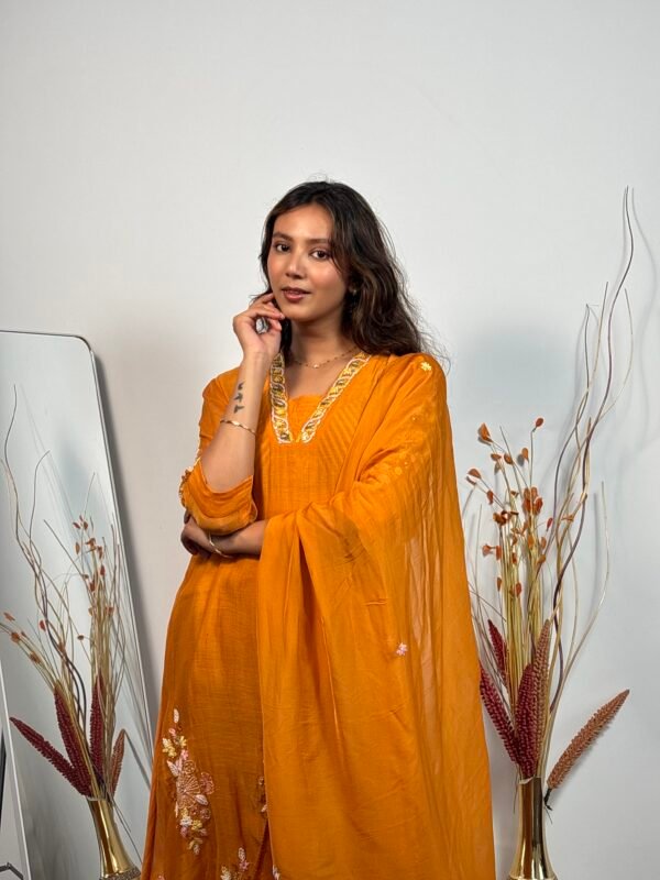 The Guldasta Mul Suit is a celebration of delicate craftsmanship and comfortable luxury. Made from premium mulmul cotton, the kurta showcases detailed floral embroidery in earthy tones, complemented by a matching dupatta and straight pants. The fabric feels soft against the skin, while the flowy design ensures ease of movement. Ideal for festive occasions, get-togethers, or even semi-formal events.