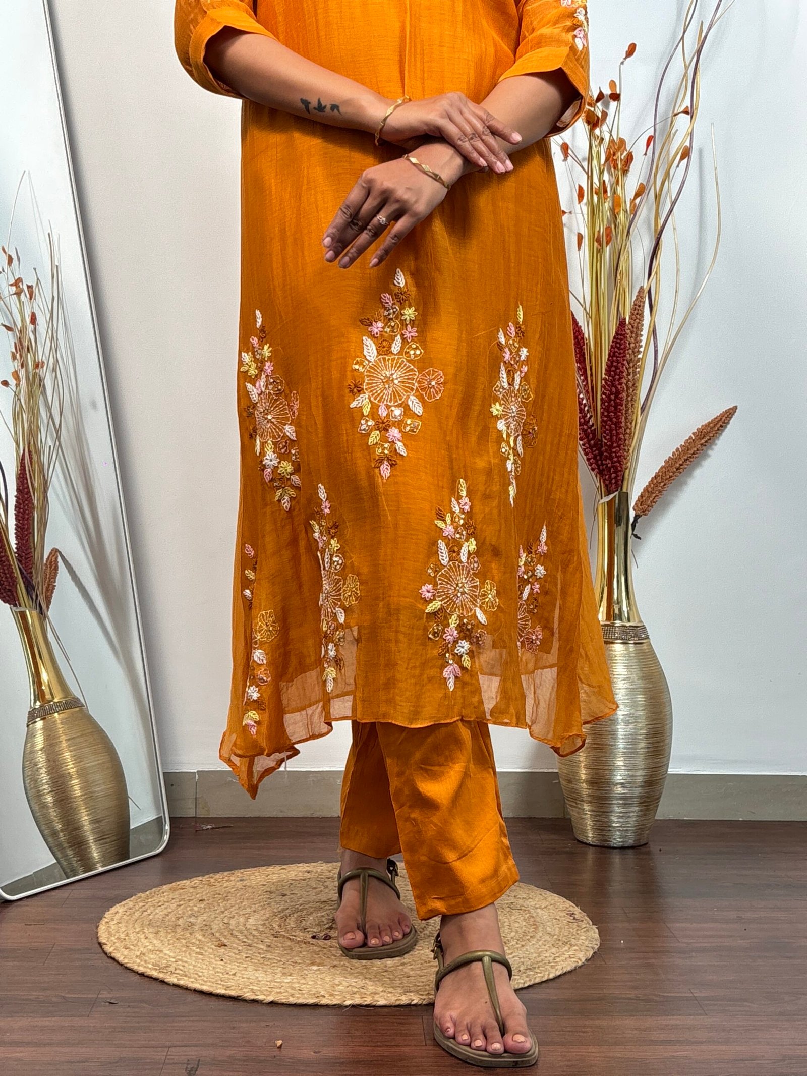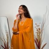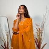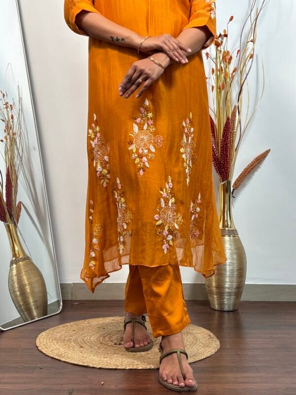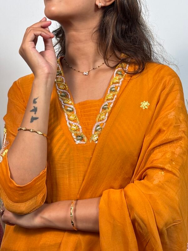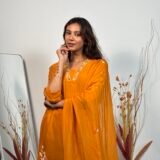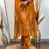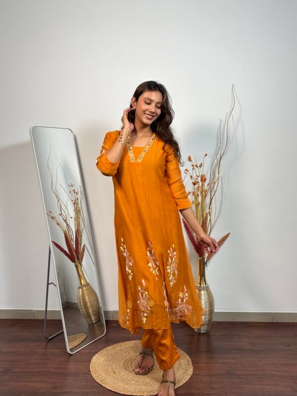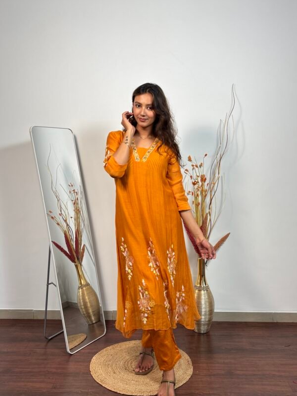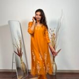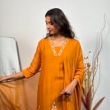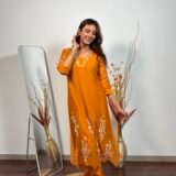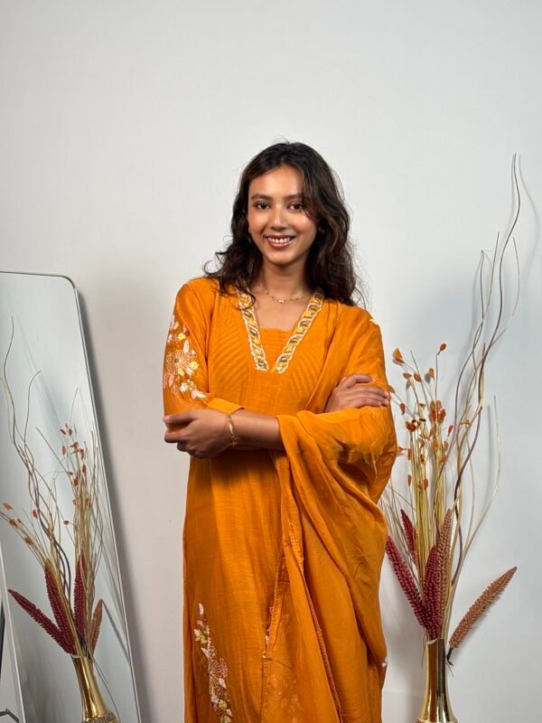 The Guldasta Mul Suit is a celebration of delicate craftsmanship and comfortable luxury. Made from premium mulmul cotton, the kurta showcases detailed floral embroidery in earthy tones, complemented by a matching dupatta and straight pants. The fabric feels soft against the skin, while the flowy design ensures ease of movement. Ideal for festive occasions, get-togethers, or even semi-formal events.
