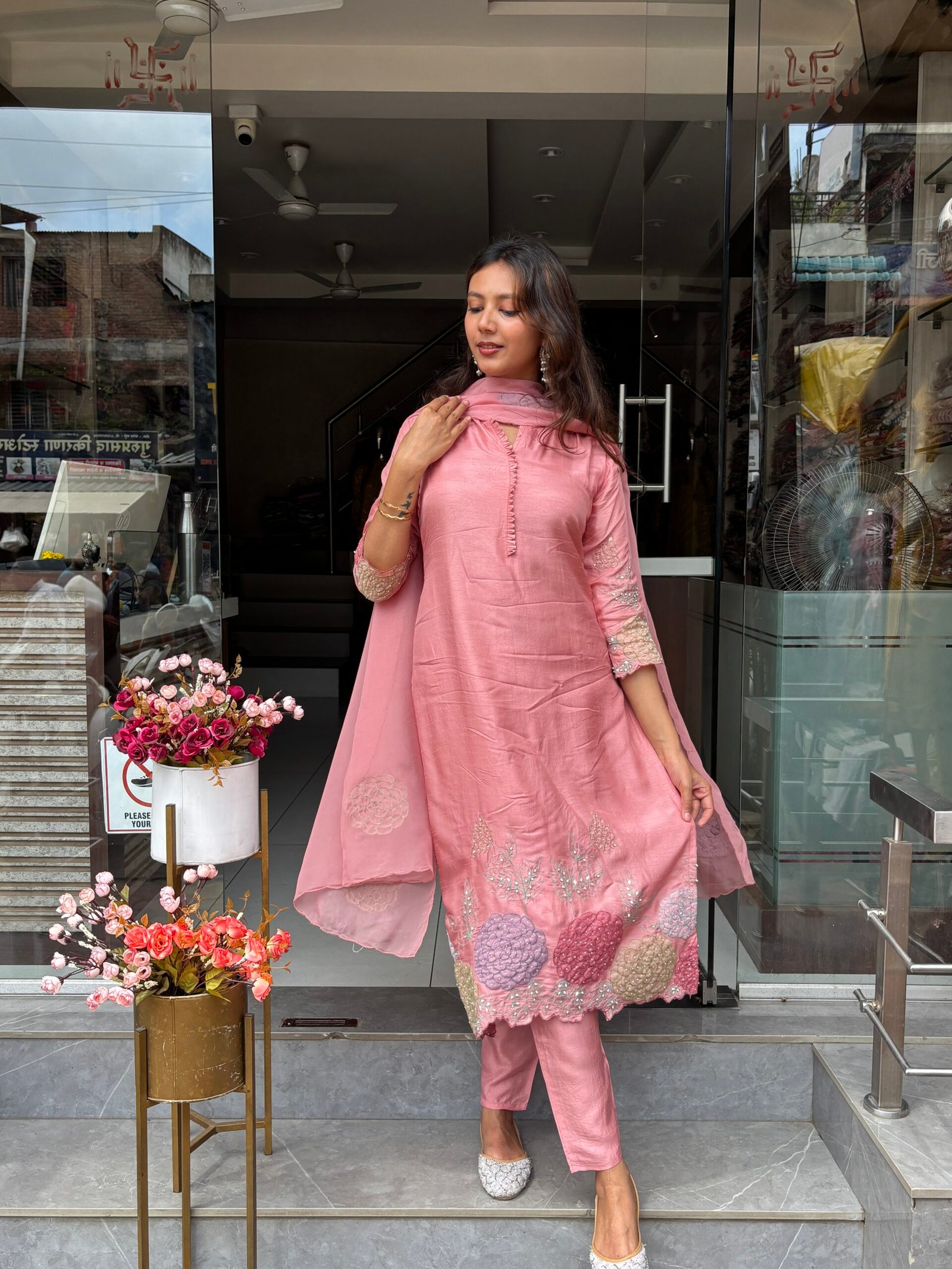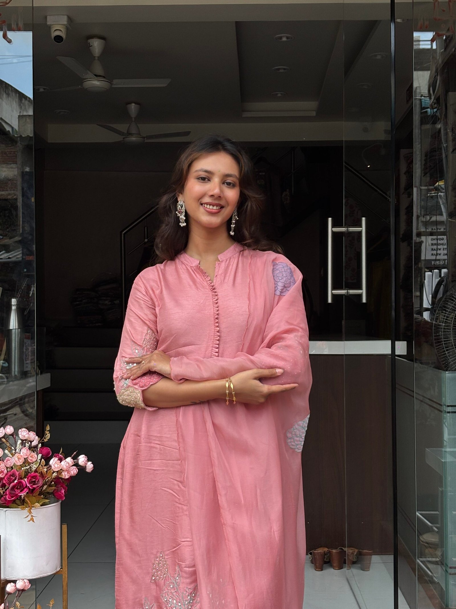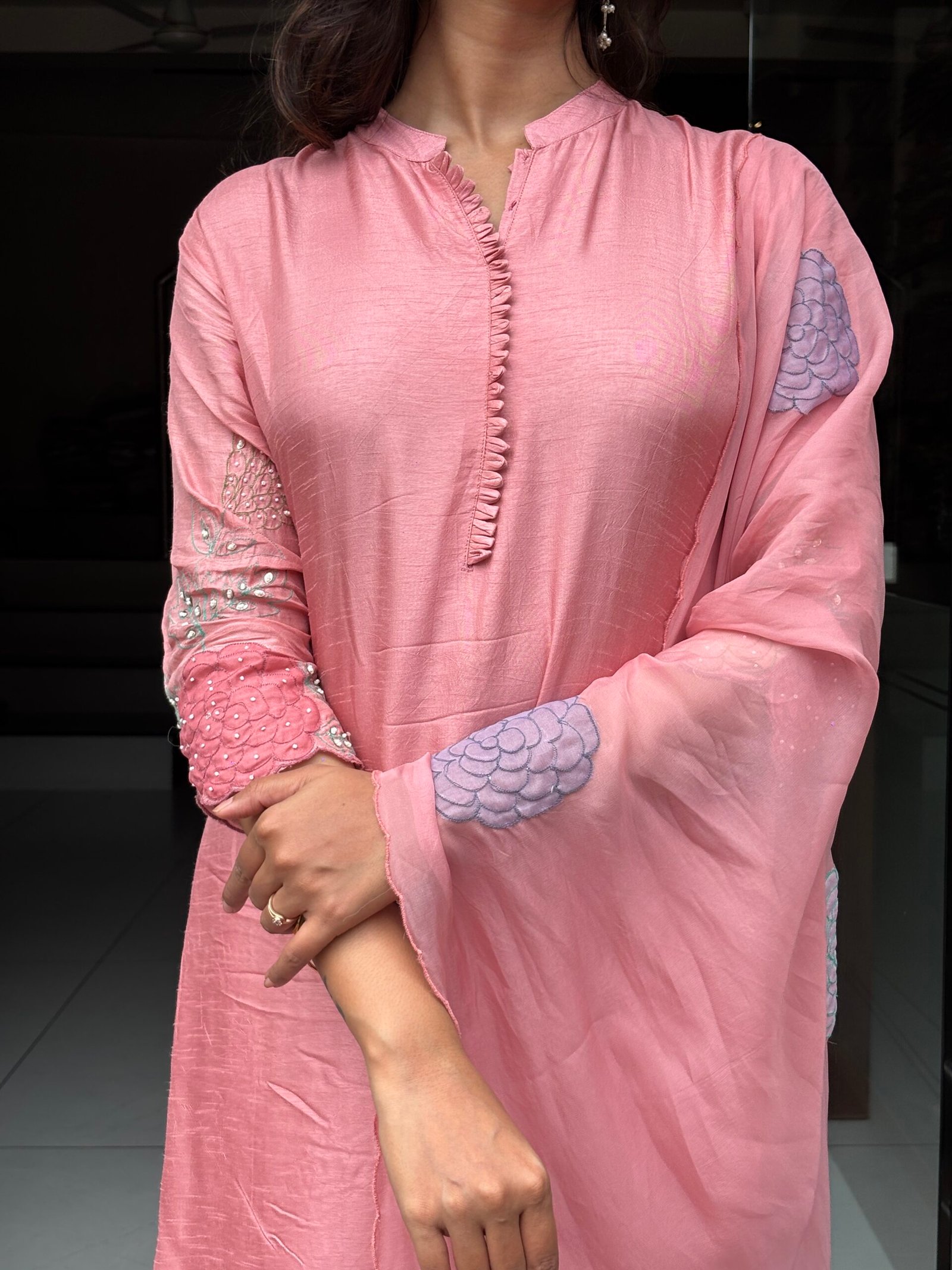 A luxurious Dress set featuring intricate floral embroidery and rich fabric for that graceful festive flair.