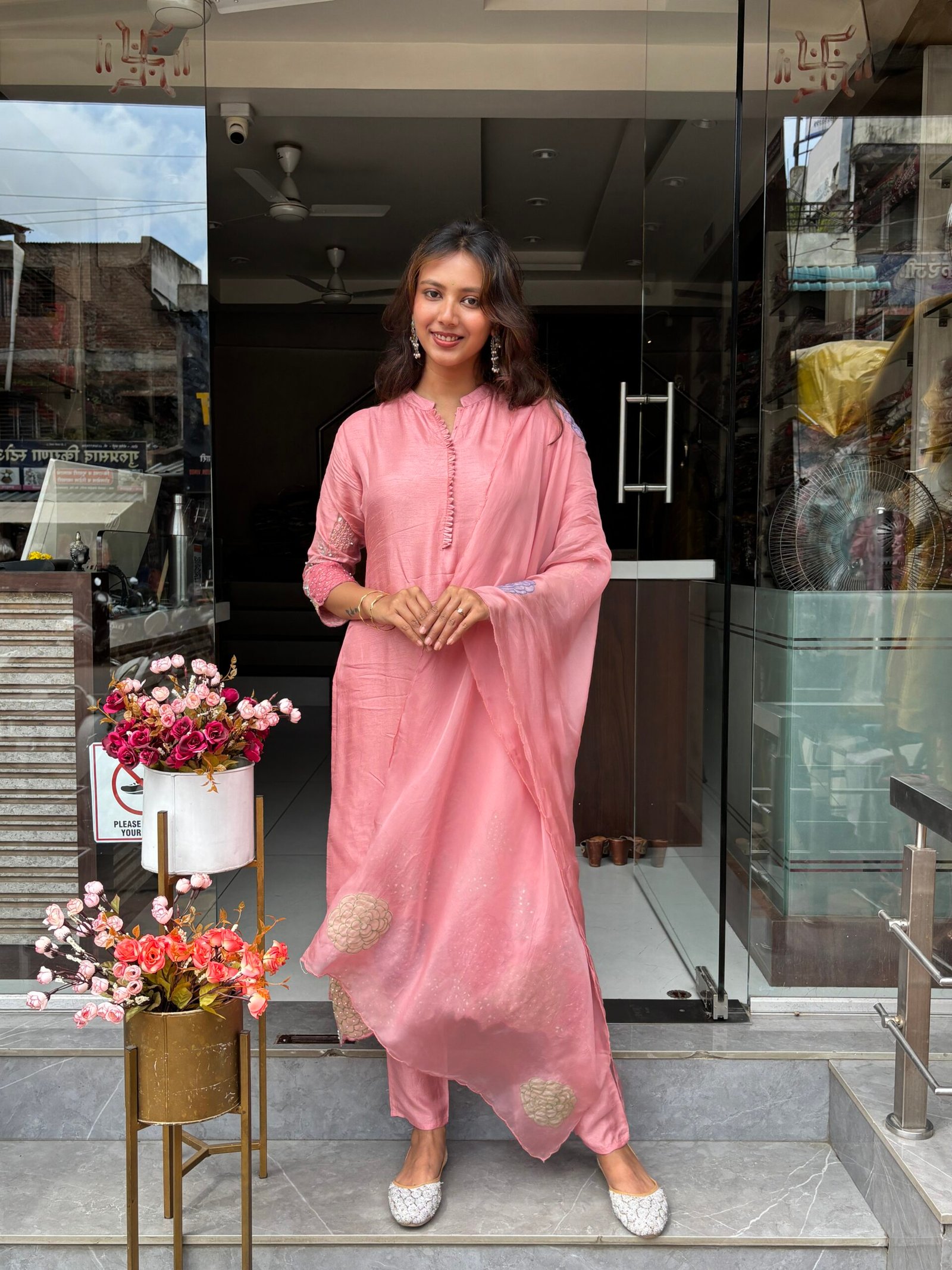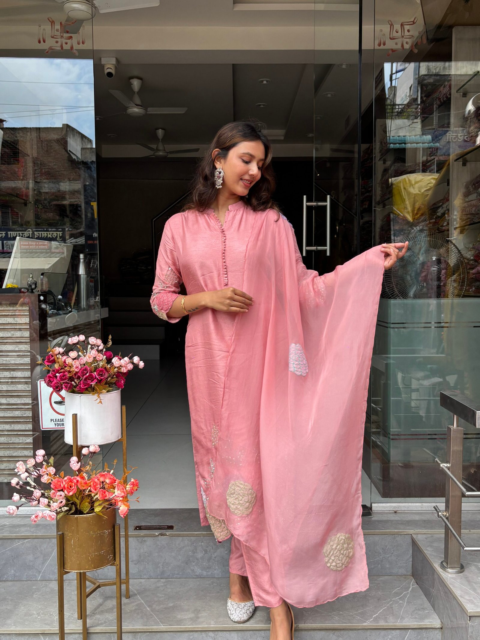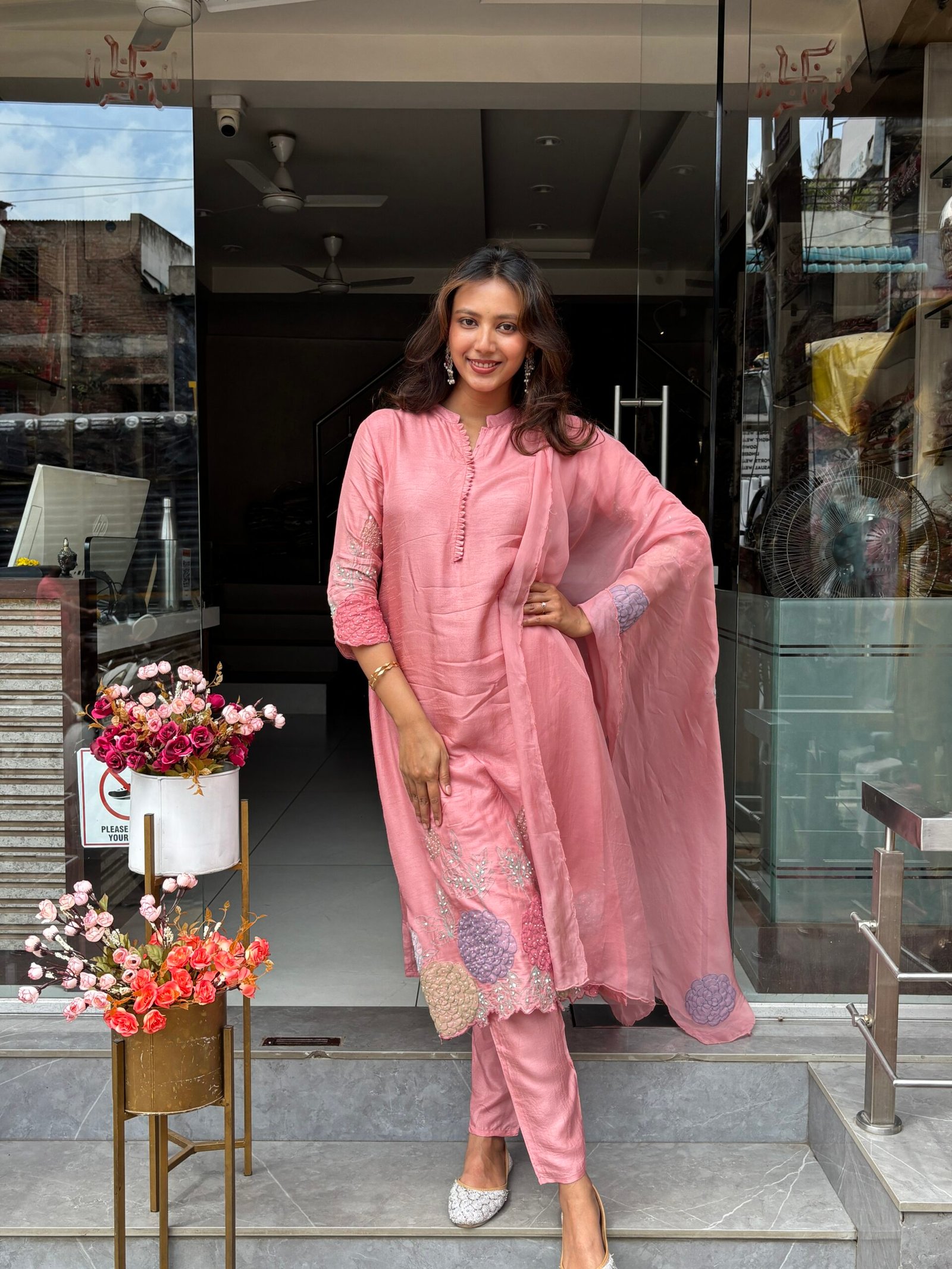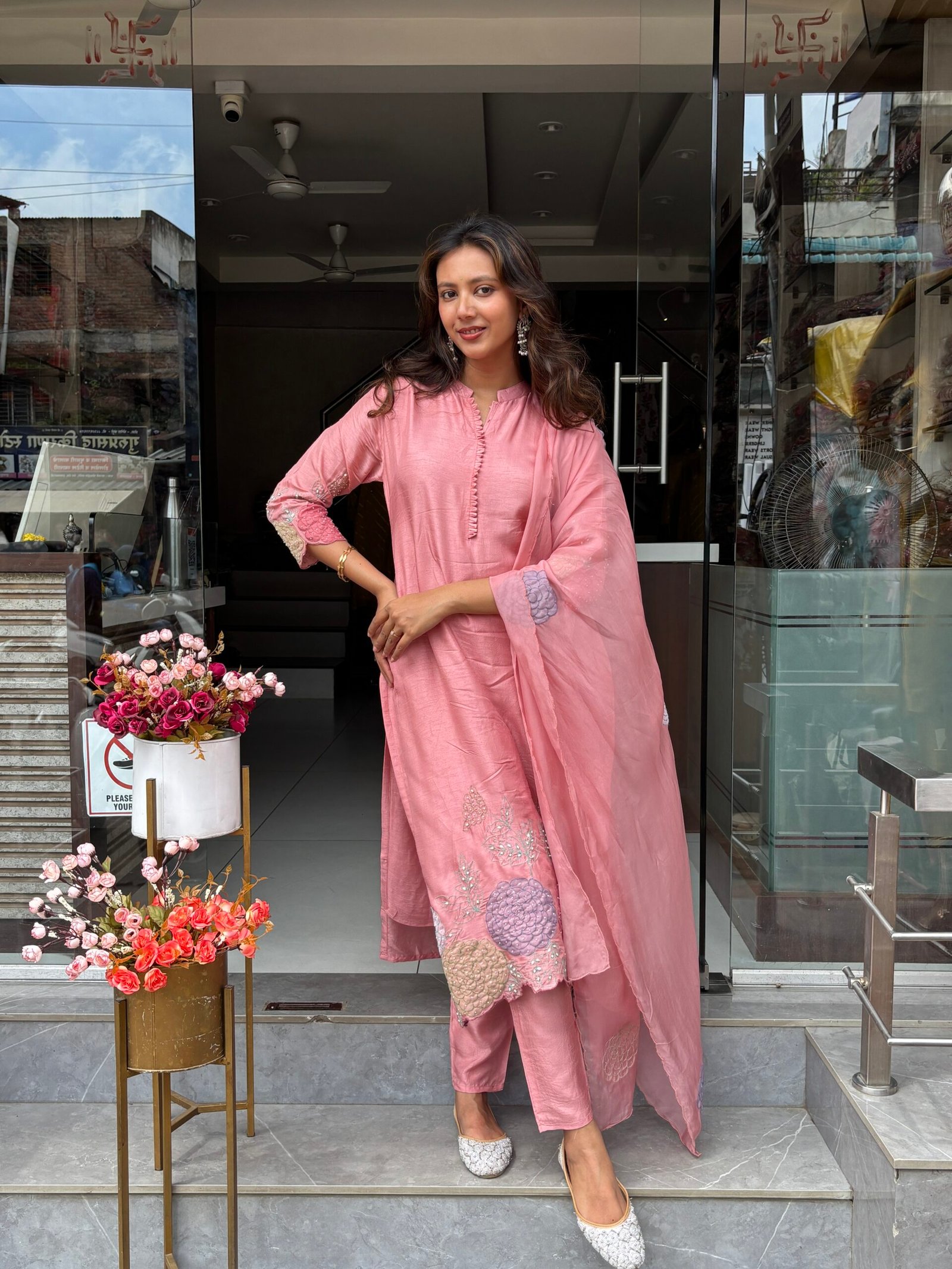 A luxurious Dress set featuring intricate floral embroidery and rich fabric for that graceful festive flair.