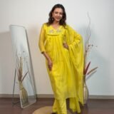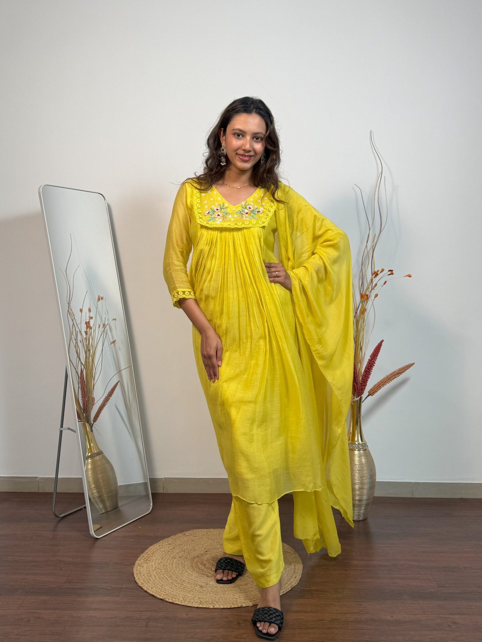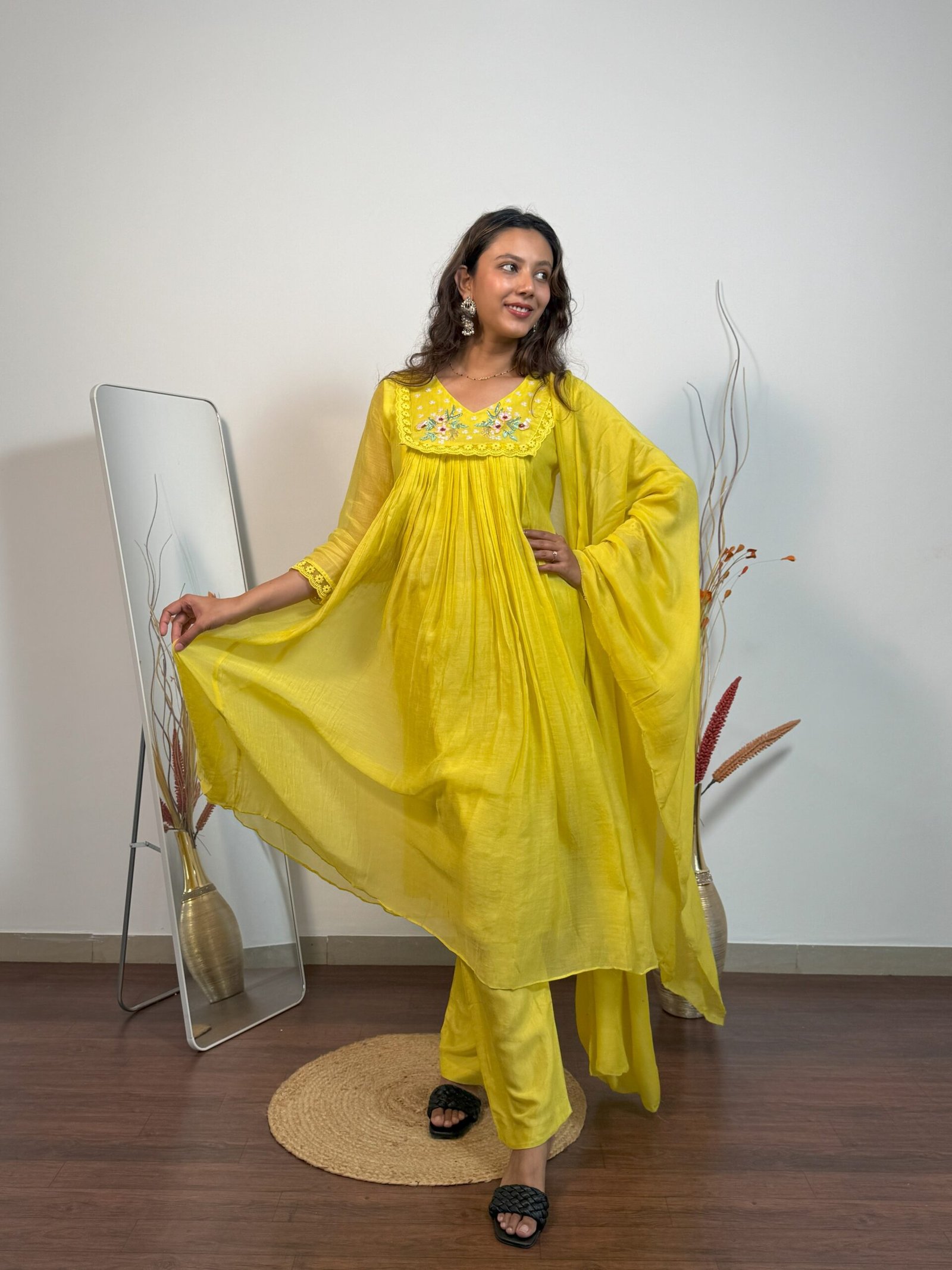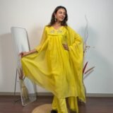 Based on Mul Chanderi fabric, this A Line suit is made witth love. Radiates freshness in every stitch.