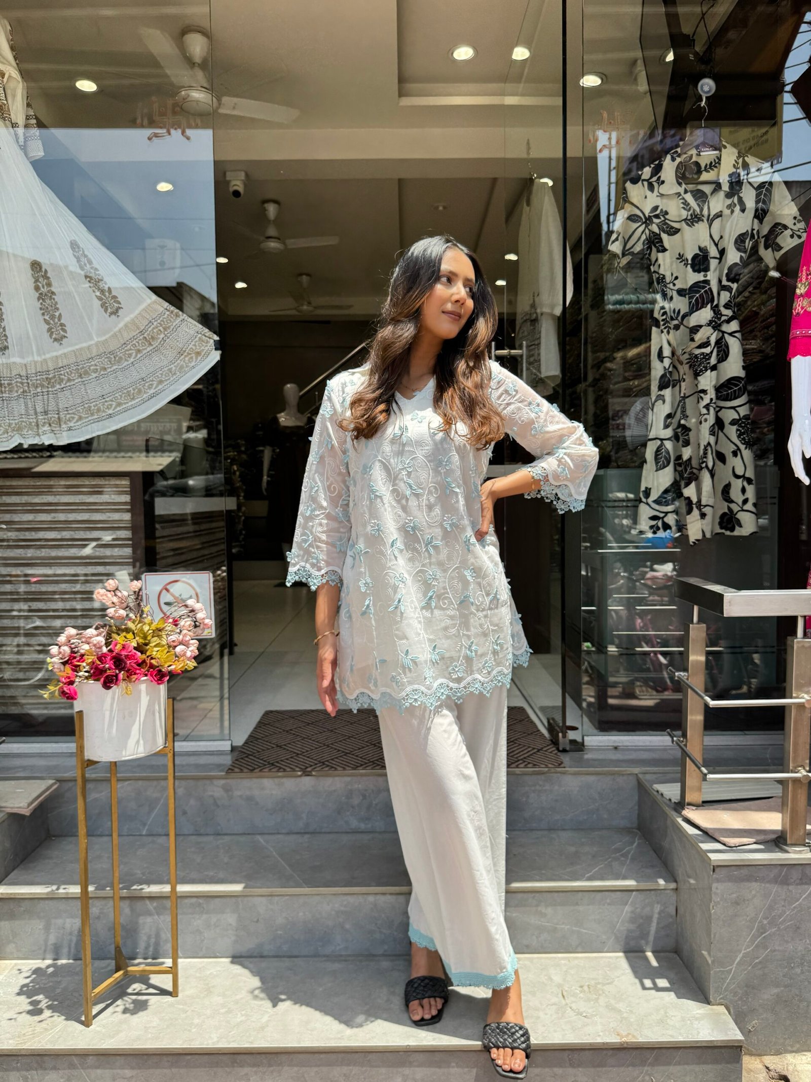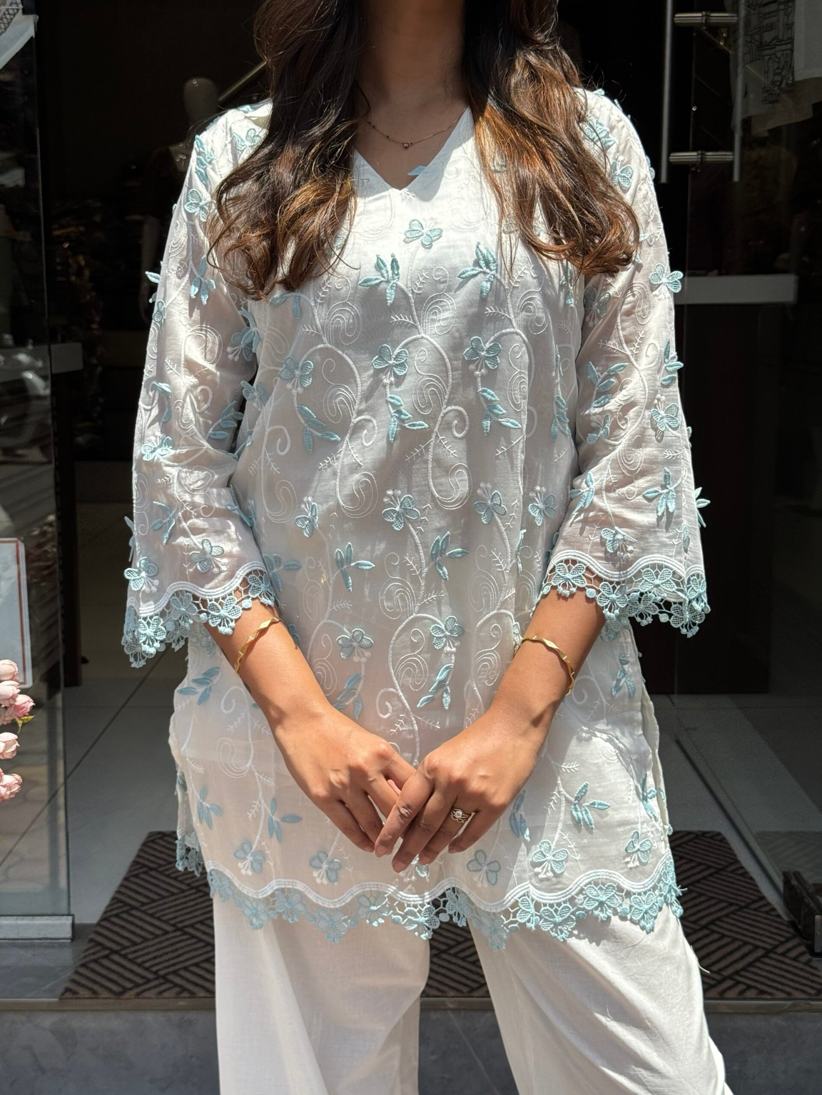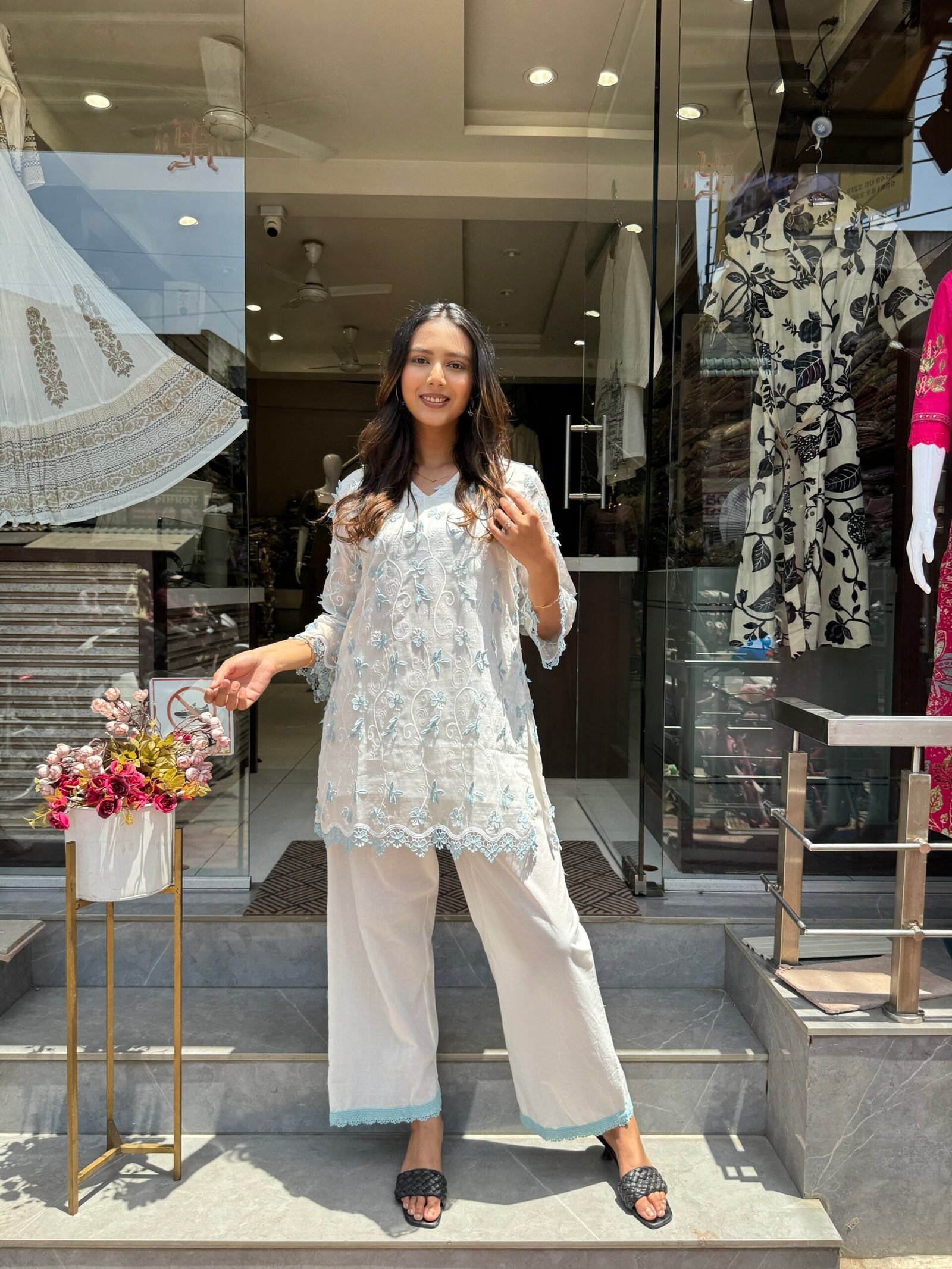 Elevate your everyday elegance with this beautifully crafted Mul Chanderi cord set, designed for comfort and effortless grace. The kurta features delicate butterfly lace work that adds a soft, feminine charm, while the airy Mul Chanderi fabric ensures a lightweight and breathable feel—perfect for all-day wear.